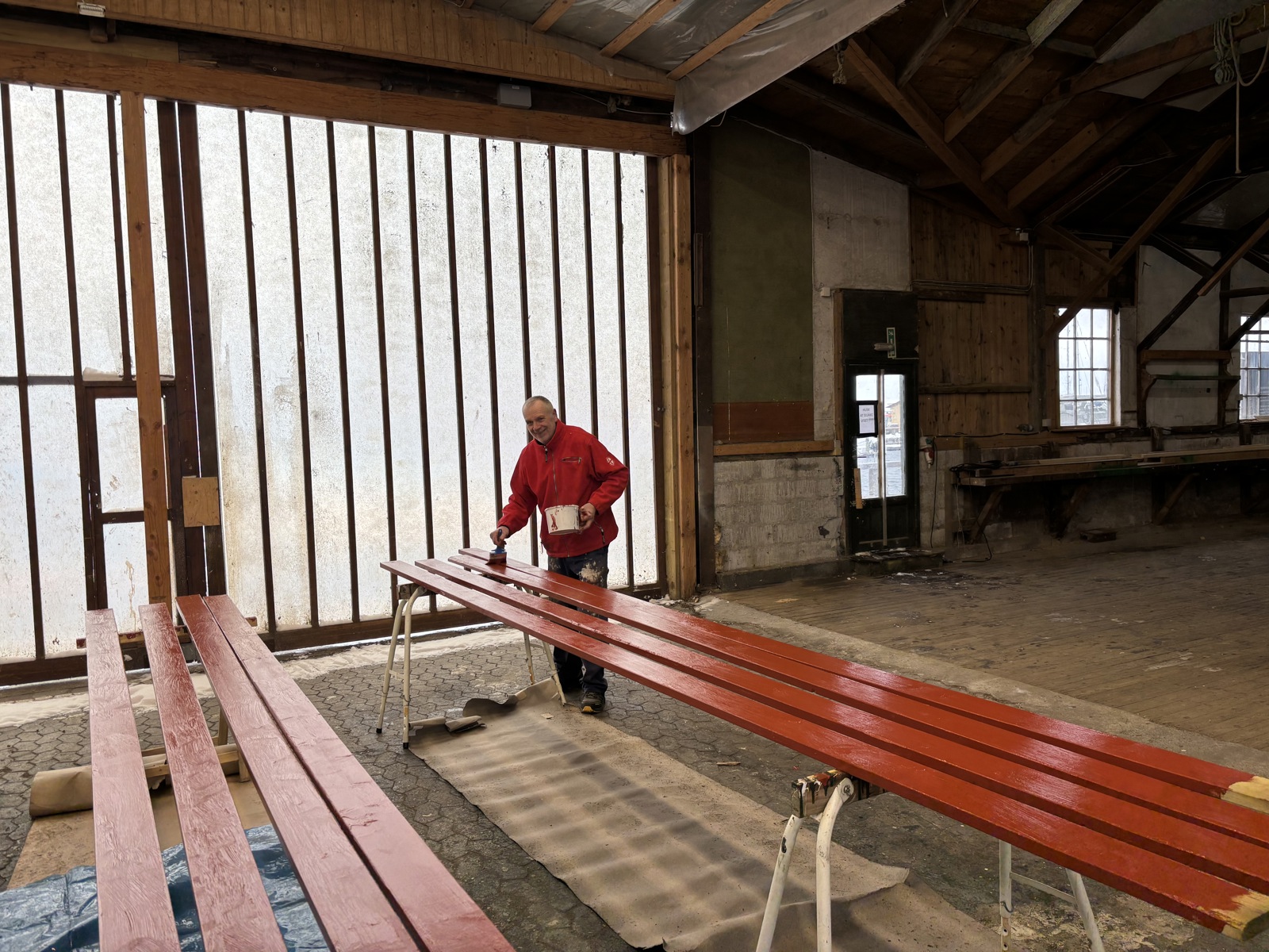 Der blev slidt godt med pinslerne, selvom vi kun var tre mand, Sven, Erik R og Jørgen, så nåede vi så langt, at malerarbejdet allerede kan afsluttes i morgen torsdag, hvorfor arbejdsdagene fredag og lørdag aflyses.